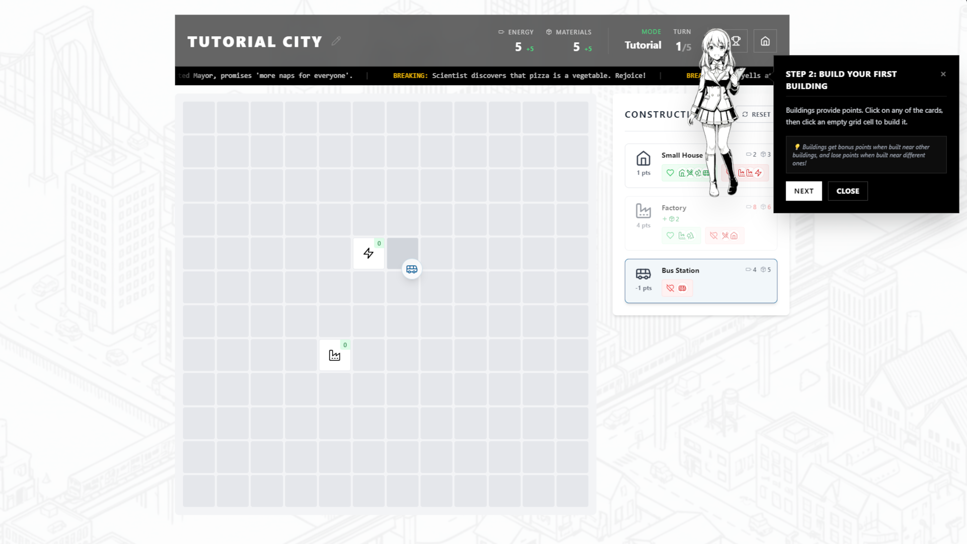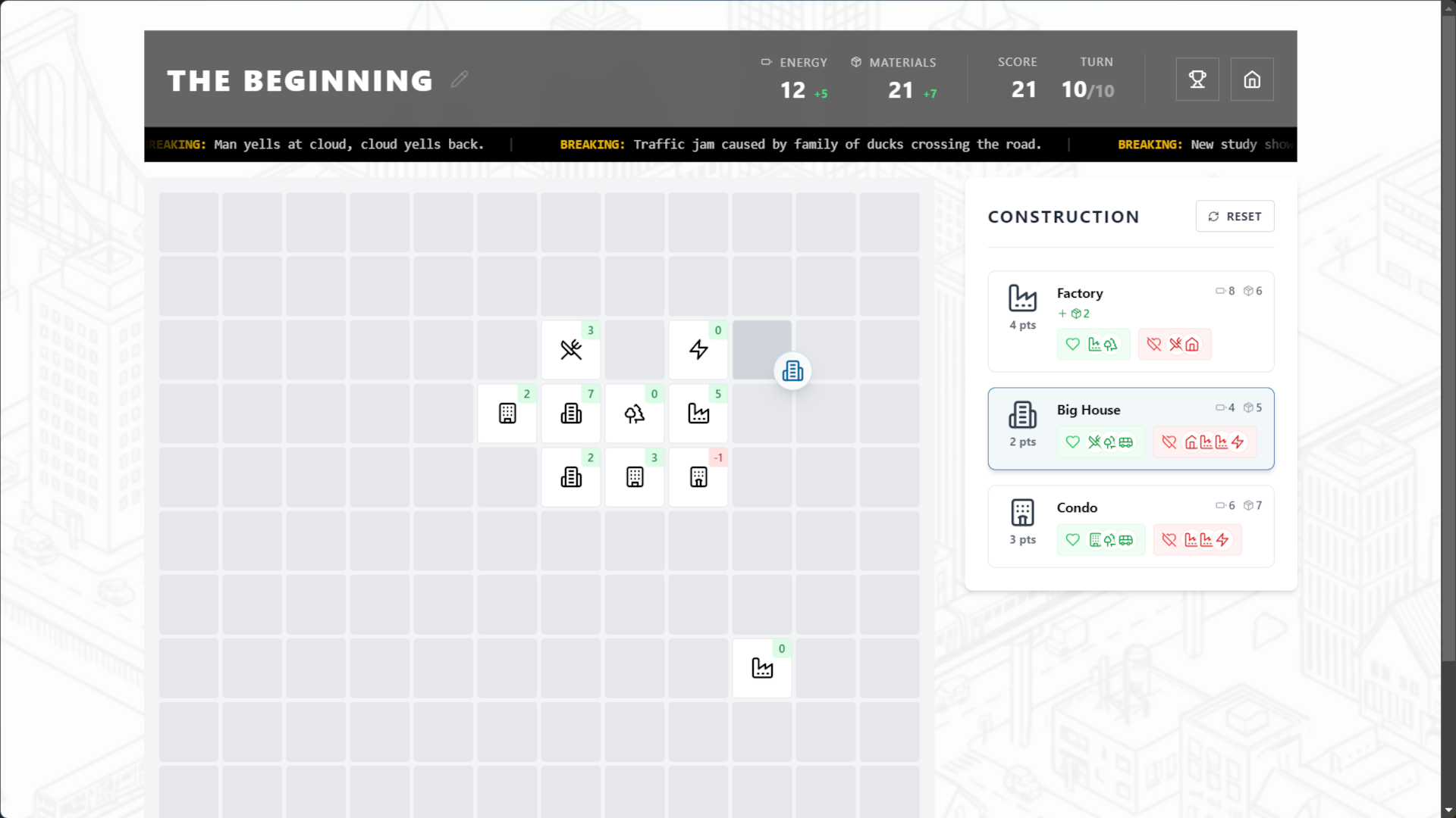 Each round, you'll be offered a choice of 3 random buildings to place on the grid. Choose wisely as synergies between different building types tend to drastically change you score.
